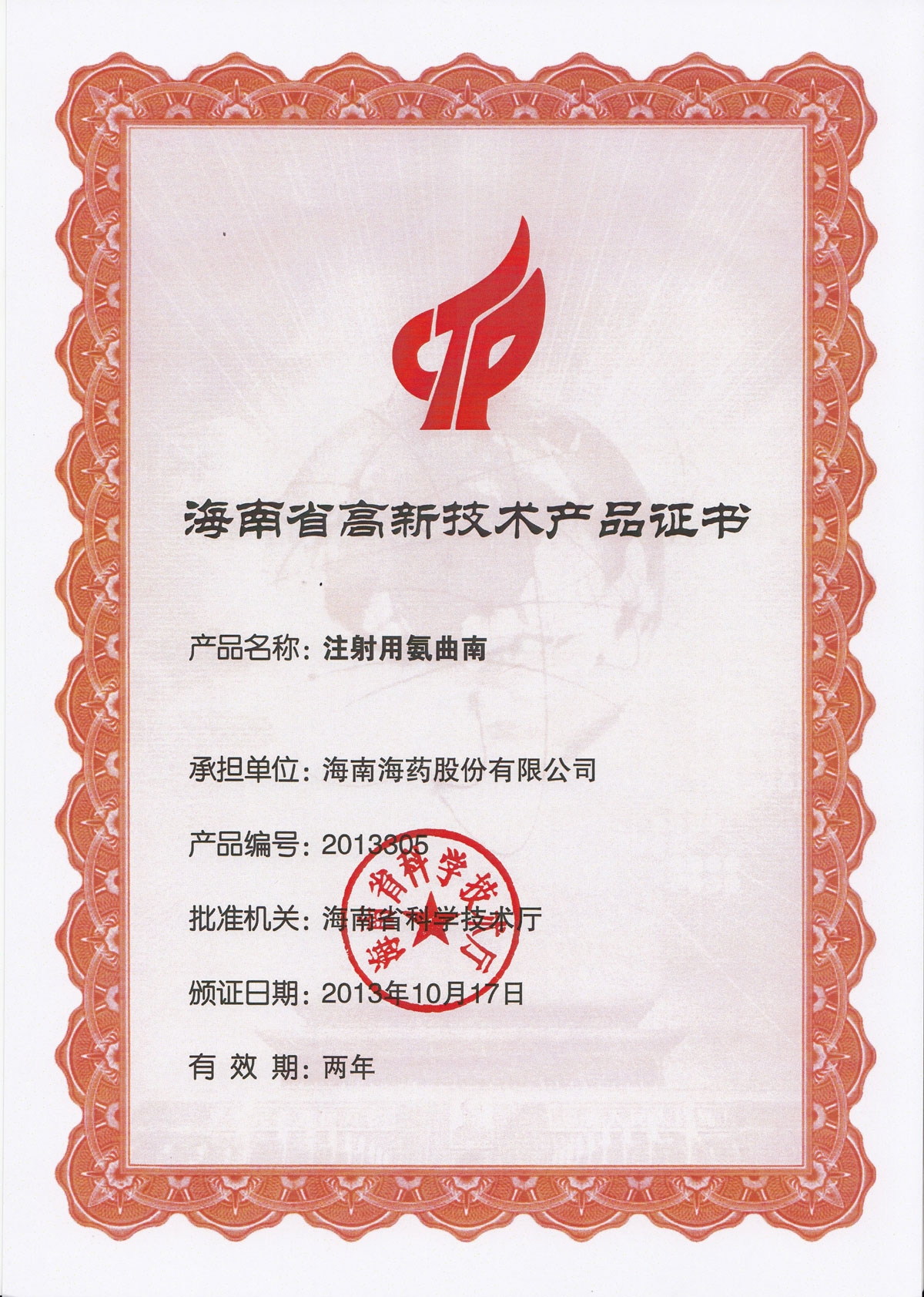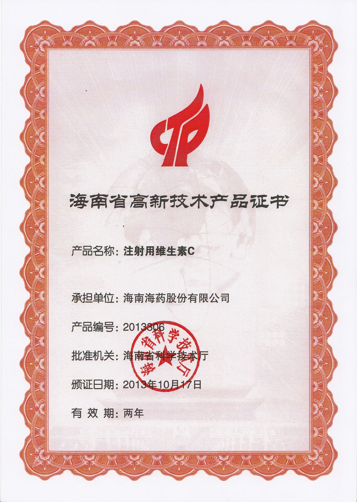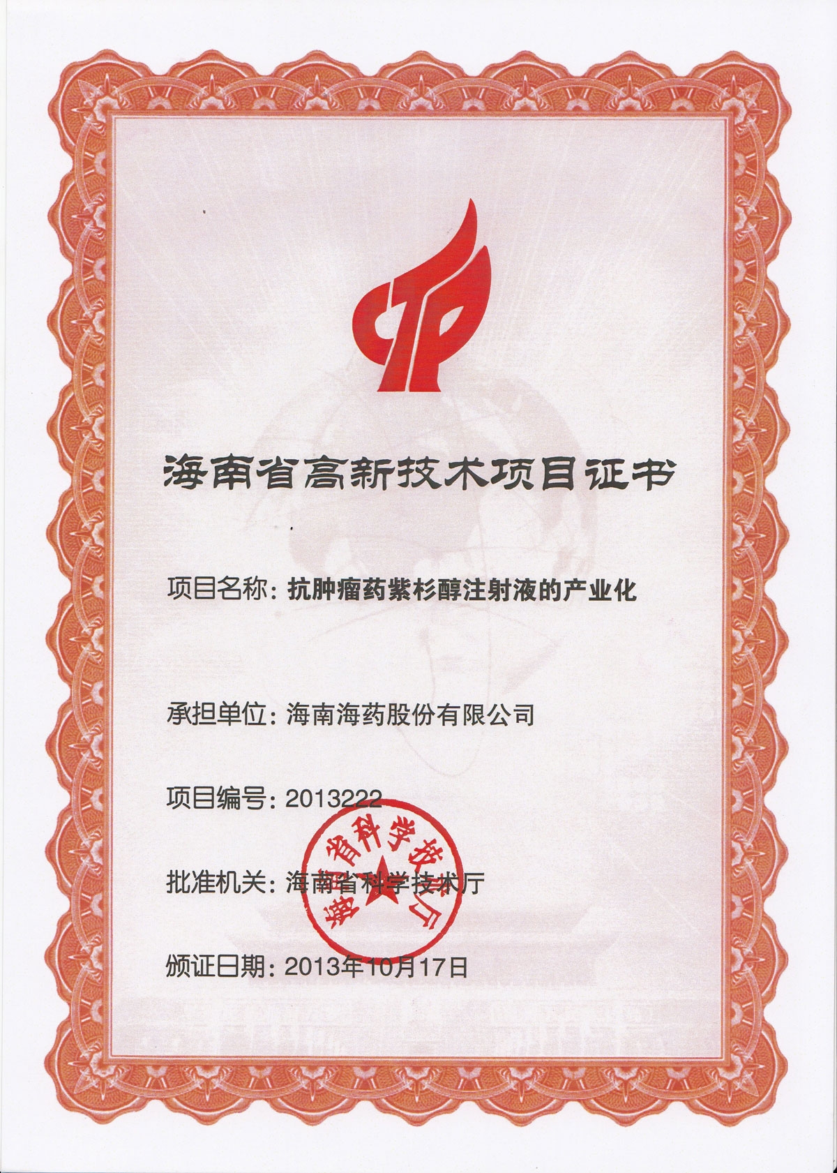 海南省高新技術(shù)項目證書